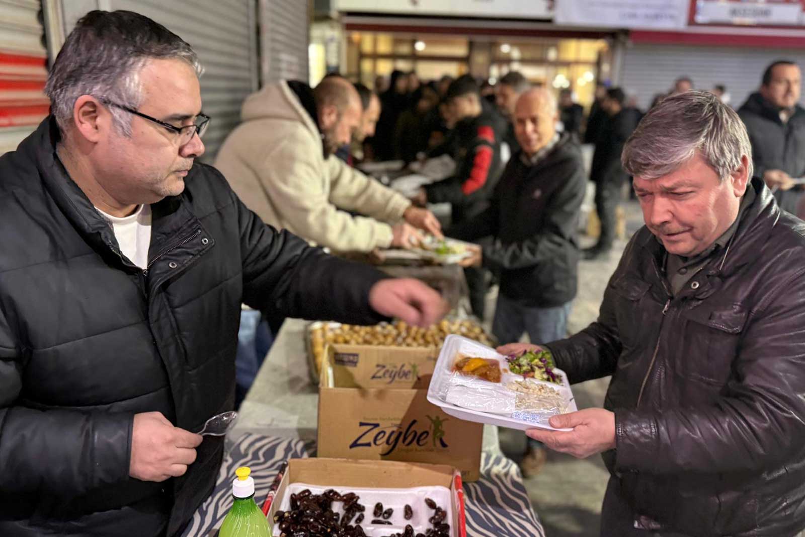 Soğuk havanın etkisiyle yemek dağıtımı, ezan saatine yakın bir zamanda ve iki ayrı noktadan gerçekleştirildi. İftar için hazırlanan menüde salça soslu köfte ve patates, pirinç pilavı, çorba, salata, Kemalpaşa tatlısı ile birlikte ekmek ve su yer aldı. Özenle hazırlanan yemekleri sıraya giren davetliler dumanı tüten tabldotlarda aldı.
