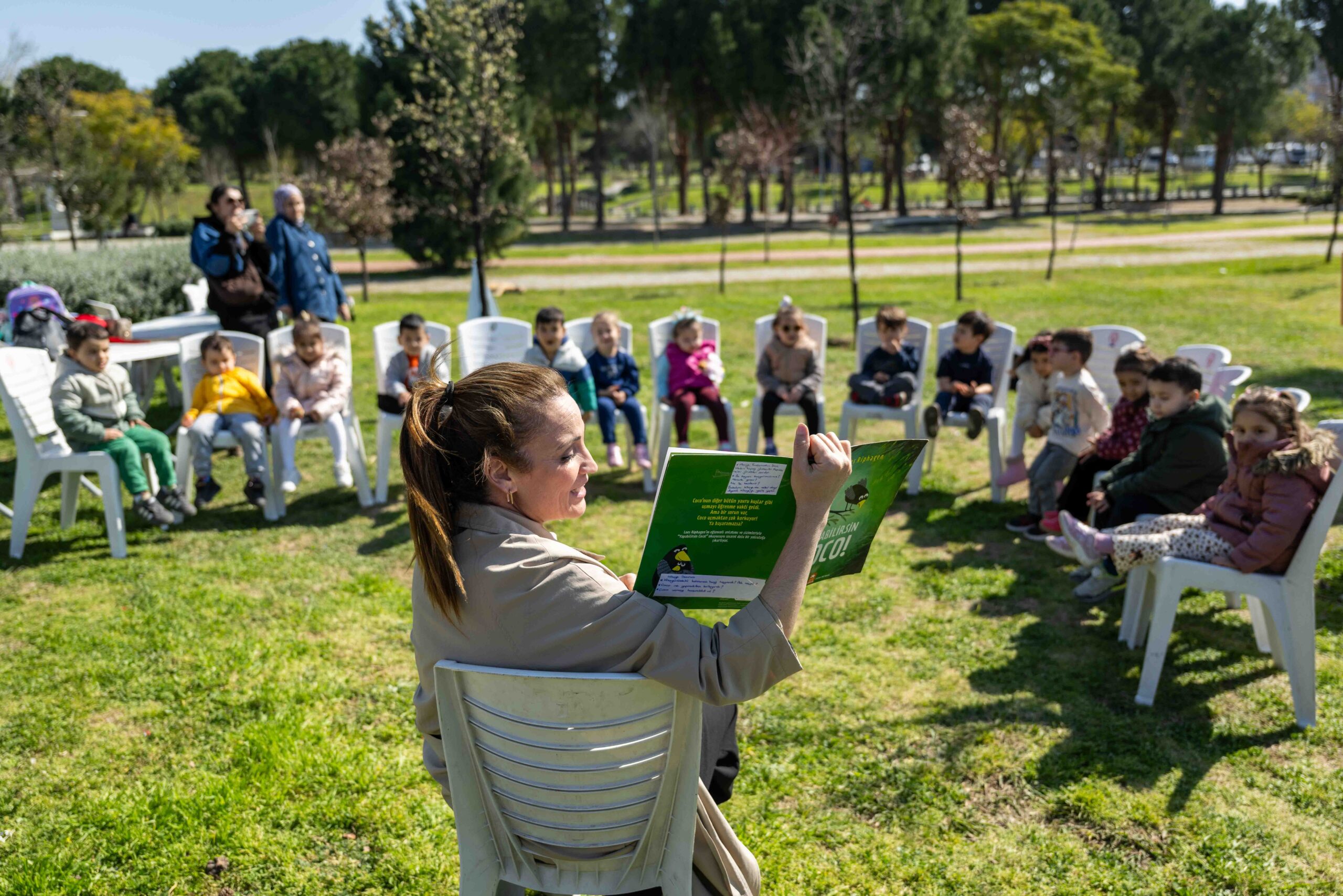 etkinlikte çocuklar kitap okuyup doğayla ilgili yeni bilgiler öğrenirken, anneler